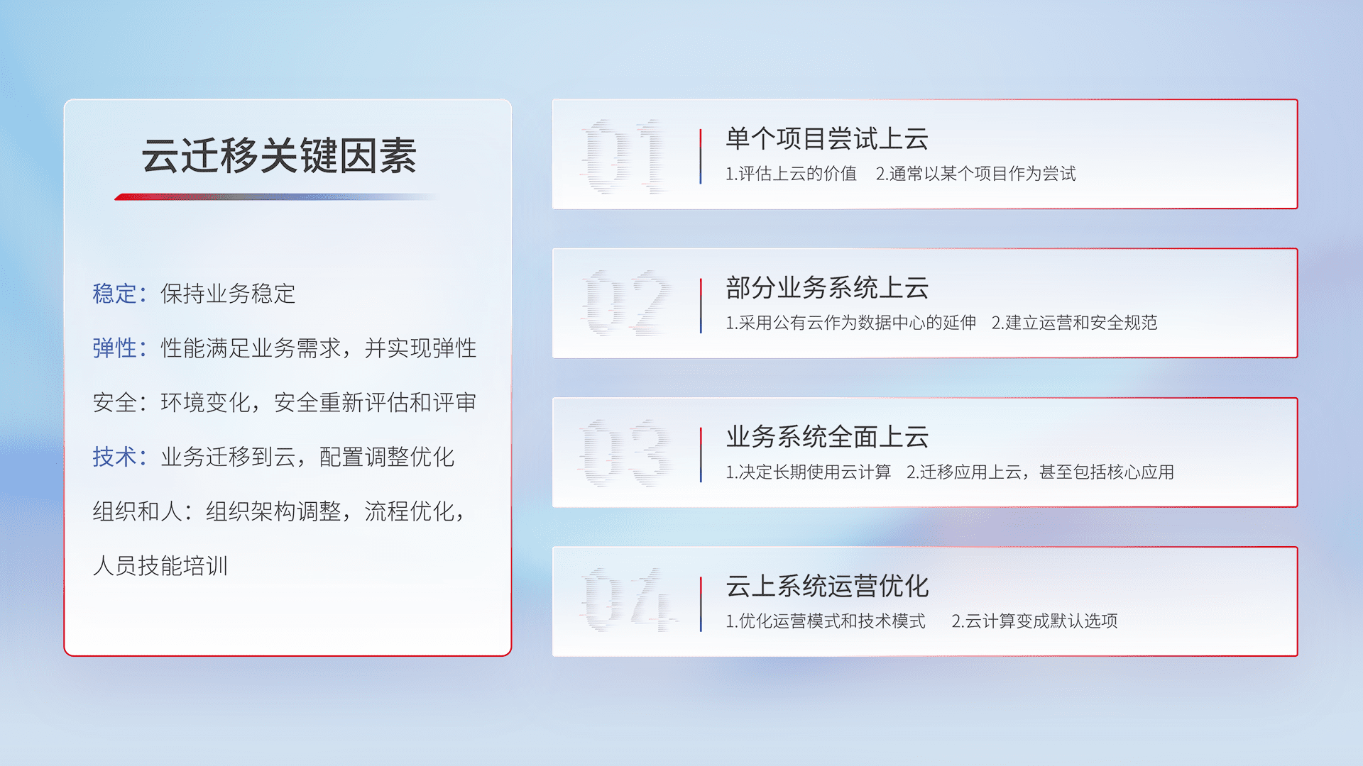 结合实际业务,,从规划设计、、、、云平台选型、、、云原生改造、、、数据迁移、、、、集成交付,,迁移全过程为客户识别最佳上云路径,,,做好风险识别管理,,设计网络架构、、、、身份权限、、、安全审计合规、、操作审计、、、日志审计、、监控告警策略、、多站点容灾设计等,,,对云上基础设施进行整体规划,,,,提升IT治理水平,,,,以满足弹性、、、、高可用、、、高性能的需求。。。。
